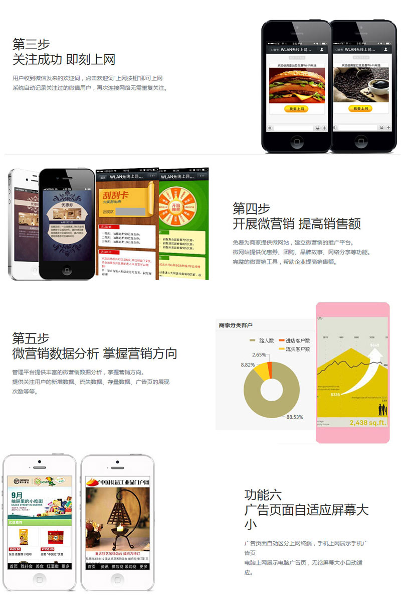 當(dāng)越來越多的企業(yè)在微信上建立公共賬號時,我們可以發(fā)現(xiàn)微信以迅猛之勢滲透到我們生活中的每個角落,可以說微信的前景被普遍看好。在此背景之下,金良網(wǎng)絡(luò)緊跟市場需求,推出無線wifi微信認證功能,幫助企業(yè)更好的管理WiFi無線網(wǎng)絡(luò)以及產(chǎn)品營銷推廣。 1、微信營銷面臨難題 雖然微信營銷方法多種多樣,但是每個企業(yè)微信運營者都也都將面臨一個重要難題,那就是:微信粉絲的積累問題。企業(yè)應(yīng)以什么方式積累粉絲量?如何在積累粉絲量的同時不掉粉?怎么才能吸引粉絲自愿關(guān)注該企業(yè)公共賬號?與此同時分析粉絲的消費能力、消費習(xí)慣、關(guān)注熱點等并制定出針對性的營銷策略等問題也非常重要。 可以說,企業(yè)公共賬號的粉絲量是品牌傳播、商業(yè)推廣的基本條件,但在微信前期如何在積累粉絲量的同時又能保證不掉粉是微信營銷的第一步,并且也是企業(yè)將面臨一個瓶頸性問題,那么該如何快速收集到目標(biāo)粉絲呢? 金良網(wǎng)絡(luò)無線wifi的微信認證上網(wǎng)功能,則為運營商解決了這一難題。 2、Wifi營銷的飛速發(fā)展 近幾年WIFI營銷這個項目可以說是炙手可熱,就連移動互聯(lián)網(wǎng)的大佬都想進來湊個熱鬧。總體上來講,WIFI營銷分為三個階段,第一個階段,是WIFI營銷的初級階段,這個時候,商家認識到了WIFI網(wǎng)絡(luò),也提供了一個免費的WIFI信號給到客戶.但是因為自身寬帶的問題,還有本身硬件問題,導(dǎo)致客戶無法進行良好的體驗,而且每次要咨詢店員密碼,體驗不是很好. WIFI營銷的第二個階段改良了WIFI的驗證方式,客戶可以自助獲得上網(wǎng)密碼.另外也提供了專門用來支持多人上網(wǎng)的WIFI設(shè)備,所以體驗有所提升。其主要模式是賺取第三方的廣告費用,設(shè)備免費給商家使用.但是從目前的情況來看,雖然它占據(jù)了大量的機場和快餐店鋪,但是商業(yè)模式還是值得商榷的問題. WIFI營銷的第三個階段,應(yīng)該是大數(shù)據(jù)階段,移動互聯(lián)網(wǎng)產(chǎn)業(yè)研究院最近推出的微信營銷系統(tǒng),不僅有WIFI的基礎(chǔ)功能.同時增加了線下用戶的大數(shù)據(jù)分析.為不同層次的客戶,提供不同類型的廣告展示. 3、當(dāng)微信與無線wifi相結(jié)合 大數(shù)據(jù)商業(yè)化、商品化的模式’正有望成為繼門戶網(wǎng)站、搜索引擎、社交媒體之后新一波的創(chuàng)業(yè)浪潮和產(chǎn)業(yè)革命。WIFI作為移動大數(shù)據(jù)的入口,即將展示它最有魅力的一面。而金良wifi是一站式智能營銷平臺,其中功能之一的微信認證就是幫助商家微信獲得更多目標(biāo)粉絲的重中之重。在剛剛過去的一年里,金良wifi足跡遍布全國各地,在此之后,顧客如果想在景悅城內(nèi)免費上網(wǎng),只需一鍵關(guān)注商家微信掃描二維碼即可,簡單方便!這樣一來,店內(nèi)客流量百分百轉(zhuǎn)化為微信粉絲量,目標(biāo)顧客迅速成為商場微信粉絲,后續(xù)的微信營銷也就隨之順理成章。 對普通用戶來說,使用微信認證來獲取免費Wi-Fi服務(wù)方便快捷,不用再去詢問是否有Wi-Fi、鏈接密碼是多少等;對于提供免費Wi-Fi的商家而言,此舉可減少客服人員的工作量,大大節(jié)省工作人員時間成本,并輕松獲取大量的目標(biāo)粉絲,實在是一舉兩得之好事。 |
