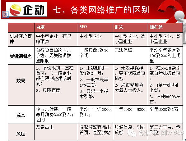 一 .網(wǎng)絡(luò)營(yíng)銷推廣的現(xiàn)狀? 1、網(wǎng)絡(luò)營(yíng)銷成為新時(shí)代的寵兒!互聯(lián)網(wǎng)的發(fā)展,讓越來(lái)越多的人開(kāi)始重視并選擇網(wǎng)絡(luò)營(yíng)銷推廣!網(wǎng)絡(luò)營(yíng)銷大大改變了企業(yè)的營(yíng)銷方式! 二.企業(yè)網(wǎng)站宣傳推廣新助手-商匯通 "商匯通"是國(guó)內(nèi)首家專注于搜索引擎首頁(yè)精準(zhǔn)營(yíng)銷的電子商務(wù)云銷平臺(tái),整合企動(dòng)公司8年技術(shù)積累和優(yōu)秀合作平臺(tái),幫助客戶實(shí)現(xiàn)成百上千個(gè)精準(zhǔn)關(guān)鍵詞自然排名8大搜索引擎首頁(yè),方便、快捷、穩(wěn)定實(shí)現(xiàn)企業(yè)搜索引擎推廣。 三.選擇我們的十大理由 1、五大搜索引擎首頁(yè)排名推廣! 四.商匯通和百度推廣競(jìng)價(jià),官網(wǎng)優(yōu)化比較 |